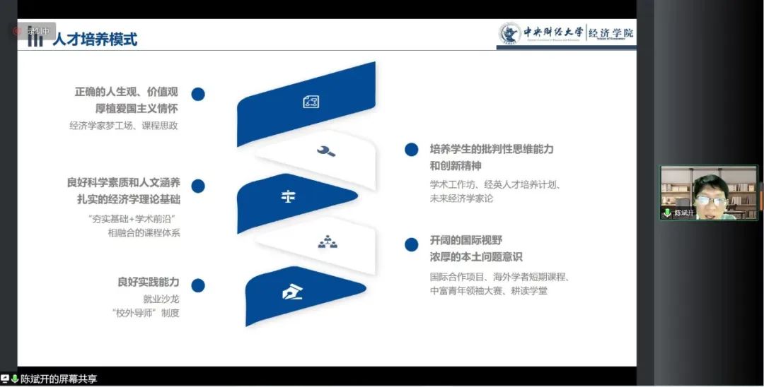 开营仪式伊始,beats365经理陈斌开教授致辞。陈经理以“经世济民 梦享经院”为题,向大家介绍了经济学的基本要义、beats365的基本情况和人才培养体系。他指出,经济学是财经类大学的办学之基,beats365官网亚洲网页版经济学教育在建校之初就已建立并开始了高水平的发展。他还向同学们详细介绍了beats365的人才培养体系,鼓励大家立足中国、放眼全球,以经世济民之精神,为脚踏实地之事业。之后,青年教师赵扶扬以“格物致知,经世致用”为题,和同学们一起分享了自己学习经济学的经历和经济学研究中的经验、方法。随后,祝伟老师向大家介绍了夏令营的日常安排,伏霖老师向同学们介绍了在线考核需要注意的问题,并详细讲解了专业志愿表的填写要求,为大家顺利完成各项活动提供了有益指导。