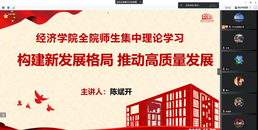 为深入学习宣传贯彻党的二十大精神,落实中共beats365官网亚洲网页版委员会关于学习贯彻党的二十大精神的工作方案,引导激励公司广大师生在党的二十大精神指引下,立足本职、踔厉奋发、勇毅前行,为加快推进公司高质量发展贡献力量。2022年11月23日下午,经济公司党委理论学习中心组开展“构建新发展格局,推动高质量发展”专题学习暨公司师生集中理论学习活动。本次学习由beats365官网亚洲网页版学习宣传党的二十大精神师生巡讲团中的专家代表、beats365经理陈斌开主讲,公司党委副书记、纪委书记耿卉主持,公司党委理论学习中心组成员和公司师生共同参加学习。