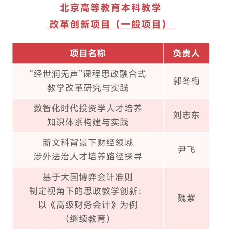 公司郭冬梅教授主持的““经世润无声”课程思政融合式教学改革研究与实践”项目获2024年北京高等教育“本科教学改革创新项目”立项。