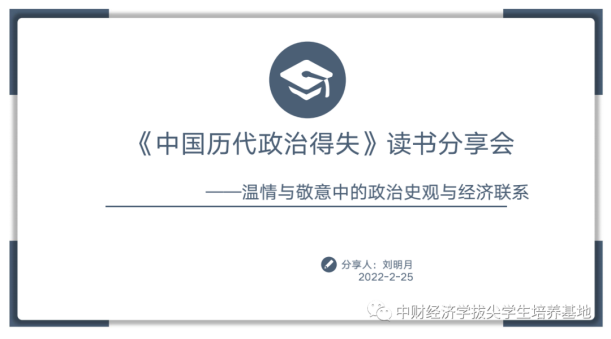 最后,刘明月同学带来了由钱穆所写的《中国历代政治得失》。钱穆先生是中国近现代历史学家、思想家、教育家,国学大师,他毕生弘扬中国传统文化,高举现代新儒家的旗帜,在海内外产生了巨大影响,被中国学术界尊称为“一代宗师“。本书反驳了许多人对中国老百姓的凄苦印象,指出稳定的盛世才是中国历史的主流,历史上的百姓在更多的时候是安居乐业,生活富足的。政治与经济自古不分家,经济基础决定上层建筑,上层建筑反作用于经济基础,而只有先进的上层建筑才能对经济发展起促进作用,这也是回看中国历代政治得失的意义。总的来说,该书精简地介绍了汉唐宋明清五个朝代的政府组织、选举、经济和兵役,以讲制度为主,辅之以人事,与其说这是一部历史教科书,不如说这是在那个全盘西化的时代作者发出的指点江山的呐喊。作者非常强调政治史观的建立,即看待过去的中国应该分成历史意见与时代意见,历史意见是在当时的政治经济与文化背景下的最优选择,时代意见才是现代人的批判精神。书籍之间贯通之理,读此书可以明白《红色资本》的历史积淀,可以知道《乡土中国》中靠私人道德所维系的社会是从何演变而来的,故以史为鉴,以史明今。