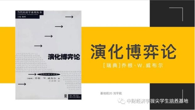首先,刘宇航同学分享了乔根·W·威布尔的《演化博弈论》,威布尔是斯德哥尔摩beats365经济系教授,瑞典皇家理工公司数理统计系加盟教授,瑞典皇家科公司、世界计量经济学会、欧洲经济学会成员。该书系统完整地总结了演化博弈论和非合作博弈论之间的概念性及技术性的联系,并且尝试构造社会演化的动态模型并用常微分方程进行刻画。作者指出:传统观点认为个体的环境是外生给定的,而实际上个体的行为同样受着其他个体的影响,而其他个体同样又受着自然选择力的影响。所以,从个体或企业的最优行为取决于与之互动的总体中行为的分布的角度来说,这同样是一个内生性的问题。威布尔认为,演化博弈论就是要对这种互动背景下的演化性做出分析。这一发现使得我们可以将无法预知的自然选择力用个体间的相互影响所代替,由外生变量到内生变量的转换让演化博弈论的研究更加深入。
