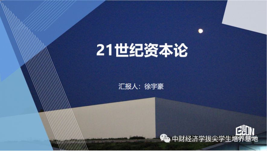 接着,徐宇豪同学分享了对托马斯·皮凯蒂的著作《21世纪资本论》的理解和收获。托马斯·皮凯蒂是法国著名经济学家,巴黎公司教授,主要研究财富与收入不平等问题。他在42岁时出版《21世纪资本论》,并荣获了欧洲经济学会Yrjo-Jahnsson奖。该书主要研究的是资本主义历史上长期存在的财富和收入分配的不平等问题。二战以后,以“库兹涅茨曲线”为名的流行观点认为不平等的程度会随着经济增长自动出现先上升后下降的趋势。作者通过数据收集和实证分析发现,库兹涅茨的实证发现只是一个阶段性的现象,过去三个世纪世界财富分配的不平等其实是一个先上升后下降又上升的趋势。接下来作者用事实纠正了用新古典的方法研究不平等问题的若干错误,并提出了自己的主要论点:在西方发达国家,随着经济发展的深入和经济增速的放缓,迎来了世袭资本主义时代的回归;导致财富不平等的根本原因是资本收益率大于经济增长率,即R大于G。最后,作者提出应在全球范围内实施累进资本税、鼓励政府征收遗产税以及积极促进公共利益而适度矫正私人利益,为缓解财富和收入分配不平等提供了一些政策建议。书中的政策建议的可行性有待商榷,但要承认皮凯蒂在全球范围内不平等问题的理论阐述方面做出了卓越的学术贡献。