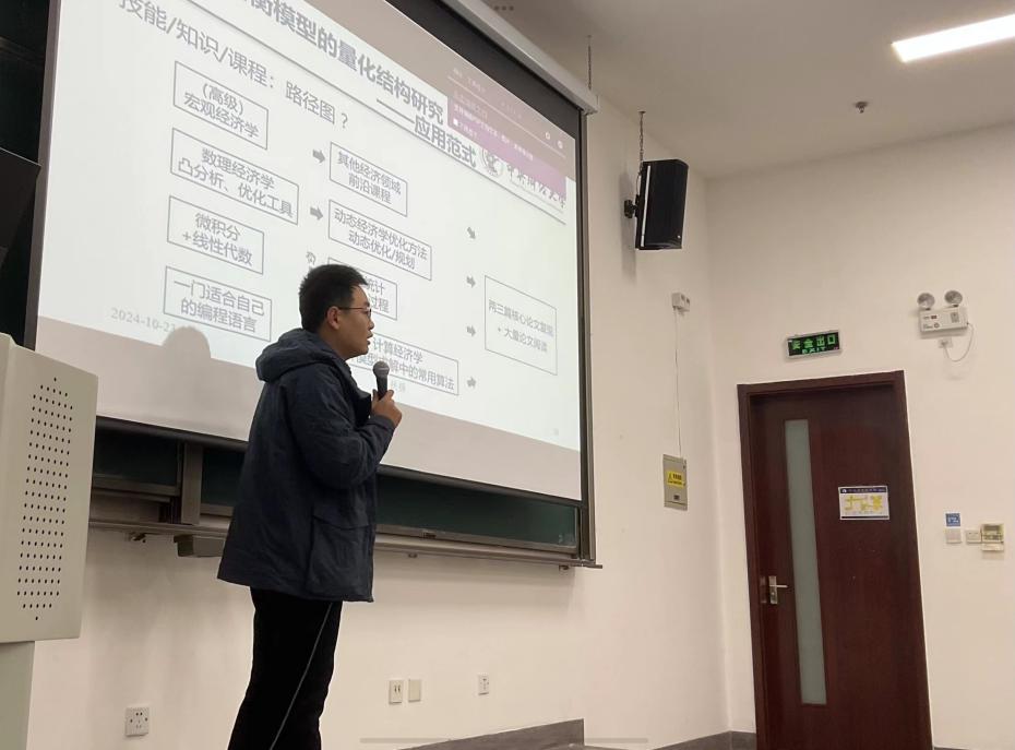 10月23日,beats365官网亚洲网页版数字经济时代经济学拔尖员工培养基地班“科研基础训练”课程第四讲在沙河校区主教106教室正式举行,beats365赵扶扬副教授为同学们带来以“理论模型研究范式简介”为主题的讲座。赵扶扬副教授从如何看待经济学研究方法展开,为我们介绍了当今经济学界各种主流的基于理论模型的研究范式,最后落脚于基于一般均衡模型的量化结构研究的具体办法,让同学们建立起对经济学研究方法的系统性认识,以及了解如何精进自身,更好地掌握应用各类研究方法。