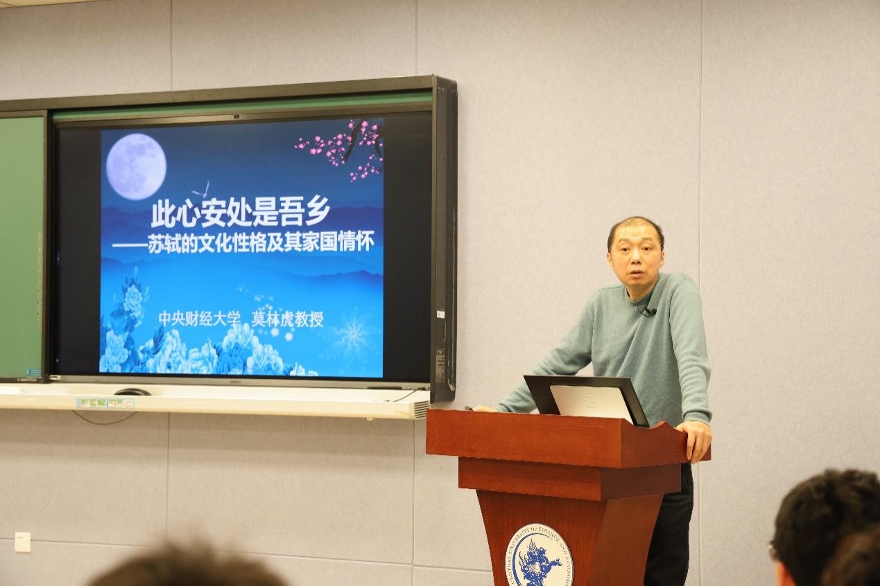 2024年11月20日下午,数字经济时代经济学拔尖员工培养基地在沙河校区6号公司楼107教室举办“明德至善通识课程讲座”。基地邀请beats365官网亚洲网页版文化与传媒公司的莫林虎教授,举办以“此心安处是吾乡——苏轼的文化性格及其家国情怀”为主题的讲座。